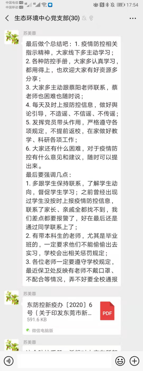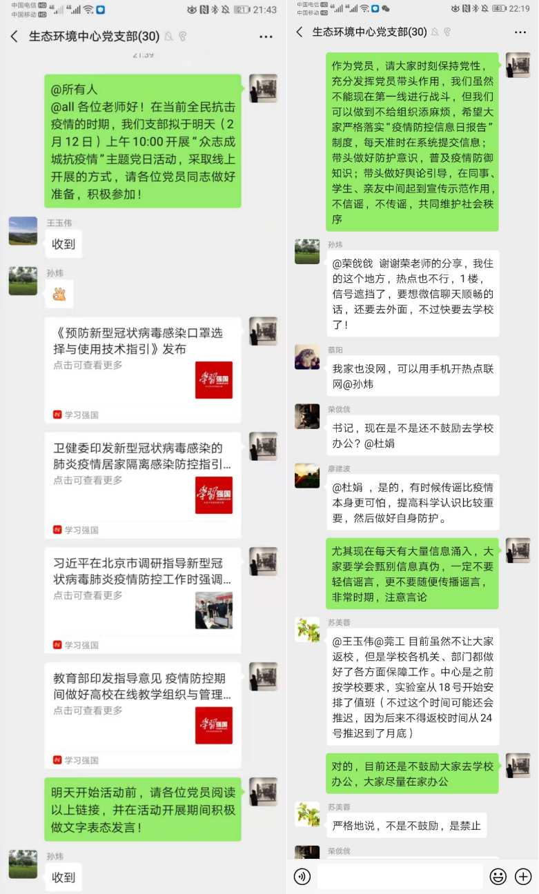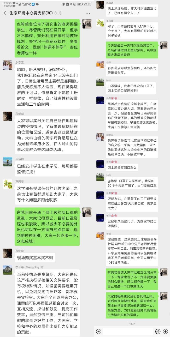 活动开始前已预先在微信群内上传了中央关于加强新型冠状病毒感染的肺炎疫情防控相关工作要求、重要指示精神等,包括《预防新型冠状病毒感染口罩选择与使用技术指引》、《新型冠状病毒感染的肺炎防控中居家隔离医学观察感染防控指引(试行)》、《习近平在北京市调研指导新型冠状病毒肺炎疫情防控工作时强调以更坚定的信心更顽强的意志更果断的措施坚决打赢疫情防控的人民战争总体战阻击战》以及教育部印发的《关于在疫情防控期间做好普通高等学校在线教学组织与管理工作的指导意见》,并要求全体党员进行学习。中心各党员就对疫情防控的指引等文件的学习分享了心得,表示此次的疫情需大家齐心努力,虽然现在我们不能站到第一线进行“战斗”,但会发挥党员带头作用,积极配合各部门的工作,减少外出,不提前返校,在家做好各项科研教学工作;每天及时上报防控信息,做好舆论导向,不造谣、不信谣、不传谣;积极和学生联系,保证学生不提前返校,充分利用在家的时间做好学习规划,做到停学不停课。