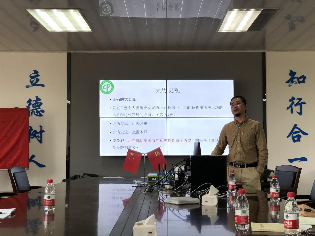 讲座中,郭奕鹏博士表示今年是建党100周年,全体教工党员必须明确学习党史的意义,了解党史学习教育的主线。讲座主要分为“时代背景、核心内容、践行路径”三个方面进行展开。