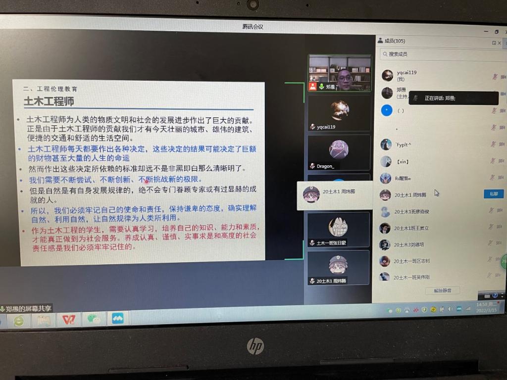院长郑愚为2020级学生线上上“思政第一课”,上课主题为《使命、生命观与大学教育》,上课学生为2020级土木工程1-3班共112人。