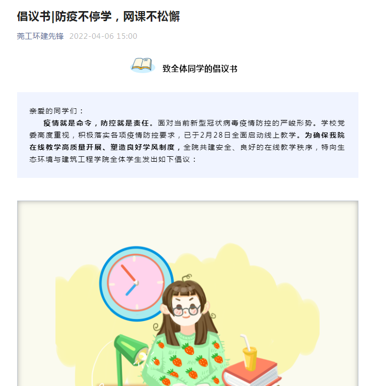 结合如何开展线上学习及新形势下如何做好疫情防控工作等展开热烈讨论,环建学院学生开展21天打卡的活动,也是让更多同学参与到坚持、自律的居家生活中,保持健康良好的生活作息和精神面貌,待疫情散去,以崭新的姿态重新回到校园。