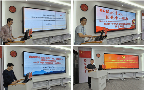 的学科专业特点,坚持以习近平生态文明思想为指导,贯彻党的二十大部署的“推动绿色发展,促进人与自然和谐共生”。学院副院长孙璨同志带头分享了学习习近平生态文明思想的体会,表示要凝聚学院教师进一步深化“绿水青山就是金山银山”的课程思政建设,不断培养致力于绿色发展的时代新人。胡守旺同志从专业的角度分析了我国碳排放形势、工业和建筑以及交通减碳措施的现状,提出要推动工业、建筑和交通转型,减少碳排放。艾心荧同志表示,学好习近平新时代中国特色社会主义思想、精准领会党的二十大报告内涵,是课程思政建设的必然要求。他以《土木工程施工》课程思政建设为实例,从分学情、研内容、定目标、梳元素、选案例、配教法、勤反思等7个方面,分享了如何将党的二十大报告内容有机融入到课程教学中思路。