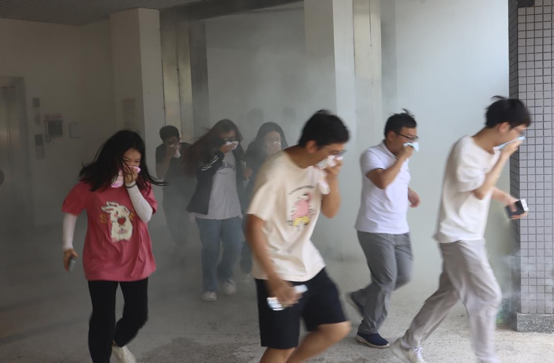 活动现场模拟火情,安保部姜因耀老师讲解疏散逃生基本方法,随着警报的响起,生态中心和材料学院研究生分两组,一组在党员孙炜同志和班长郑锐芬带领下,二组在党员徐曼曼同志和班长梁俊文带领下,从实验室按照指定路线、规定动作,迅速有序地进行紧急疏散,并到达广场集合,清点人数。