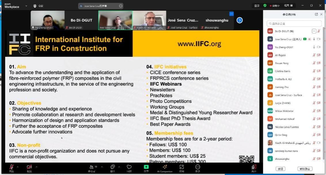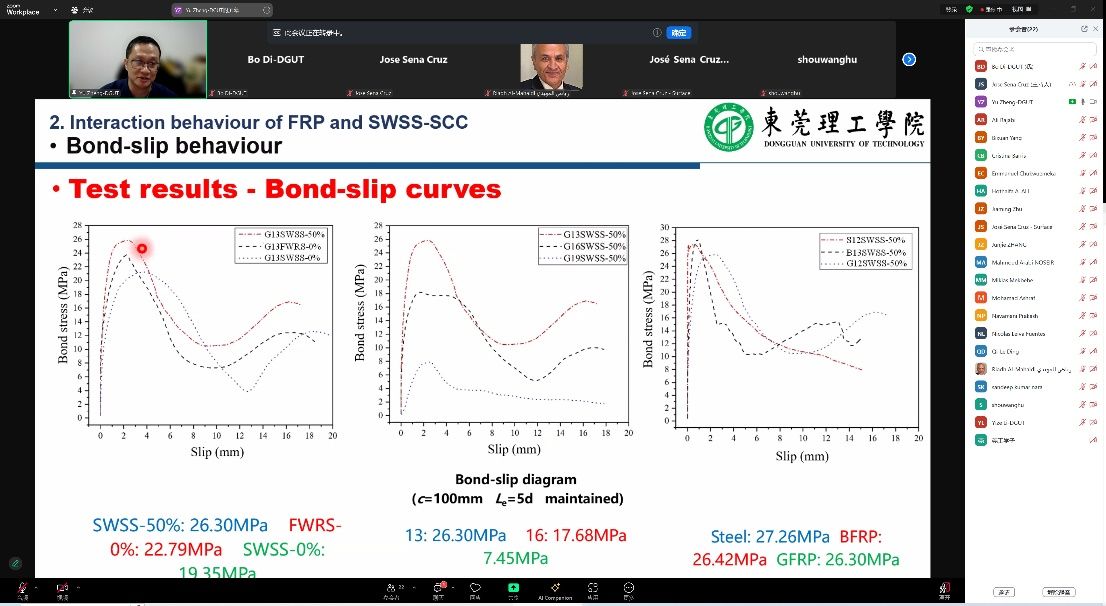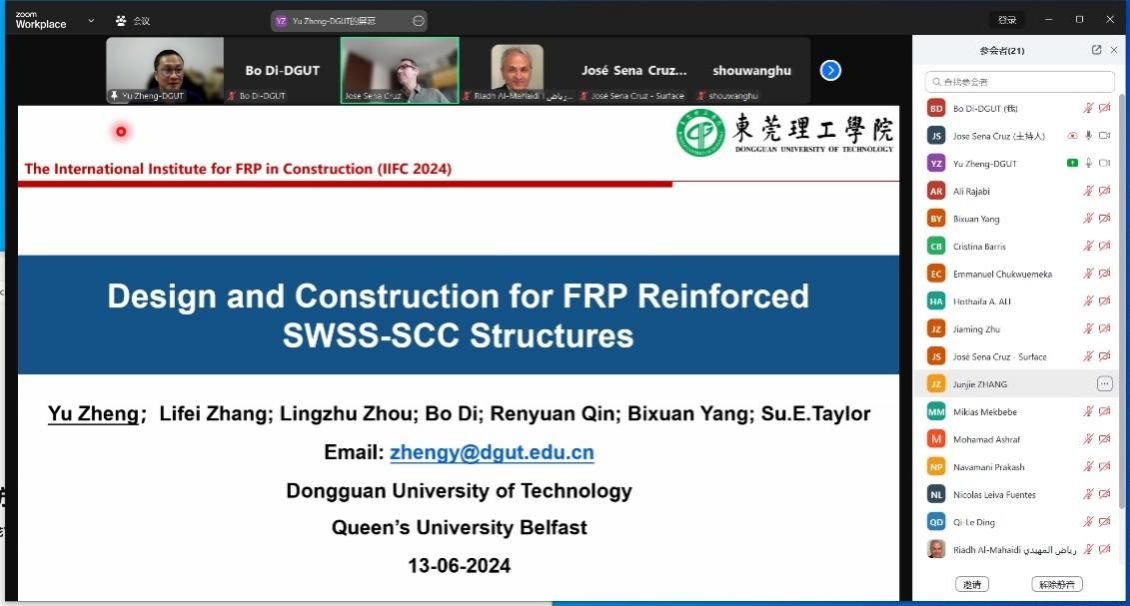 的郑愚教授受邀参加,并在线上发表题为《Design and Construction for FRP Reinforced SWSS-SCC Structures》的研究报告,展示了其在复材增强混凝土结构研究领域的最新成果。