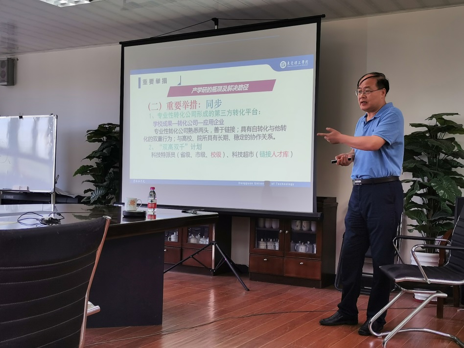 科技成果育成中心和科技超市网上服务平台的运转情况进行了介绍;对目前我校产学研的瓶颈等问题进行了深入的剖析,指出企业有需求找不到解决方案,科研机构不了解市场,缺乏专业机构的牵线搭桥,让科技成果“卡”在实验室,这些关键是“脱节”问题。同时提出了重要措施“同步”,包括专业性转化公司形成的第三方转化平台的搭建和“双高双千”计划的实施。演讲结束后,范洪波处长与环建教师们进行了充分的交流,听取了老师们的建议和意见。