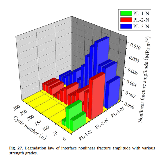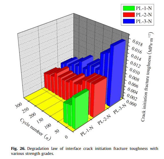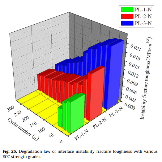 因此,环建学院田俊、郑愚、马宏伟、吴晓伟、孙璨、黄文通等人开展盐冻融作用下ECC与混凝土界面断裂特性的试验研究,得到了盐冻融作用对ECC与混凝土界面的荷载-裂缝张口位移曲线、极限劈裂荷载、极限裂缝张口位移等断裂特性的影响规律。试验结果表明,无论是否经历盐冻融循环,ECC与混凝土界面的断裂特性均表现出明显的非线性,因此本研究创新性的提出了三参数断裂模型(即起裂断裂韧度、失稳断裂韧度、非线性断裂幅值)进行描述界面的非线性断裂特性。利用断裂力学的相关理论,推导出了界面起裂断裂韧度、失稳断裂韧度、非线性断裂幅值的解析计算公式,在盐冻融循环作用下界面起裂断裂韧度、失稳断裂韧度、非线性断裂幅值的变化情况能够全面、准确的反映界面断裂特性的退化规律,进而敏感、准确、全面的分析了界面断裂特性的退化规律。