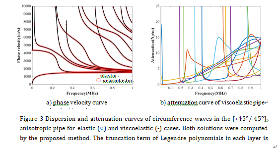 郑明方博士后在《Composite Structures》发表题为“Derivation of circumferential guided waves equations for a multilayered laminate composite hollow cylinder by state-vector and Legendre polynomial hybrid formalism”的论文。郑明方博士后为第一作者,合作导师马宏伟教授为通讯作者。该项工作解决了传统矩阵方法无法求解各向异性多层柱状结构周向导波特性的难题,同时也突破了传统勒让德多项式方式在求解多层柱状结构要求层间材料力学参数相近的限制,克服了应用传统勒让德多项式方法来处理界面位移和应力连续条件时所带来的挑战,求解了粘弹性/弹性碳纤维管的导波特性和频散特性,为复合管周向超声导波检测技术奠定了理论基础。