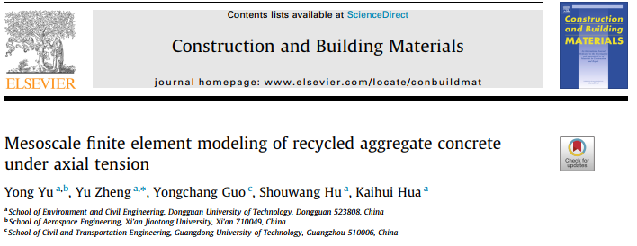余勇博士后在国际权威杂志《Construction and Building Materials》上发表了题为“Mesoscale finite element modeling of recycled aggregate concrete under axial tension”的专业论文。该文的第一作者为余勇博士,通讯作者为郑愚教授,其他参与研究人员包括爱爱视频