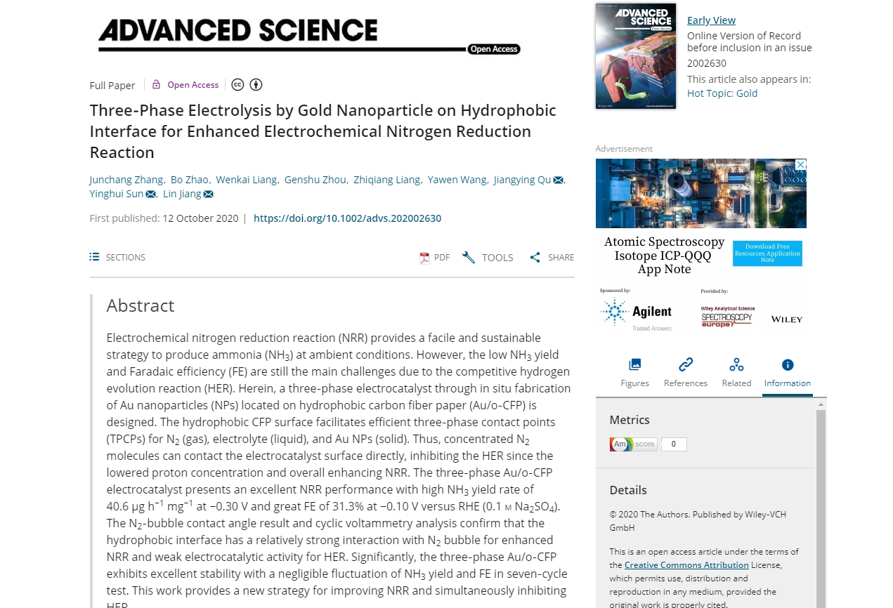 该工作以“Three‐Phase Electrolysis by Gold Nanoparticle on Hydrophobic Interface for Enhanced Electrochemical Nitrogen Reduction Reaction”为题发表在《Advanced Science》。《Advanced Science》是Wiley旗下发行的国际著名期刊,影响因子为15.8,属于中科院一区TOP期刊。该成果以爱爱视频