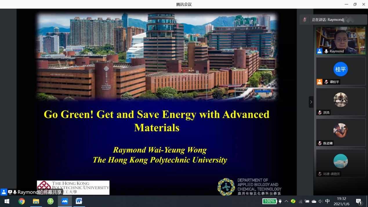 2021年1月6日,应广东省科技厅“海外名师”项目的邀请,香港理工大学应用科学及纺织学院暂任院长、应用生物及化学科技学系讲座教授黄维扬老师通过腾讯会议为学院师生作了题为“走向綠色!如何利用先進材料取得及節省能源”的网络讲座。在讲座中,黄维扬老师分别讲述有机太阳能电池和有机发光二极管的发展现况,阐述了这两项技术在节能减排中的重要作用,并在最后回答了师生的提问。讲座历时将近两小时,参与的师生人数超过120人,取得了很好的效果。