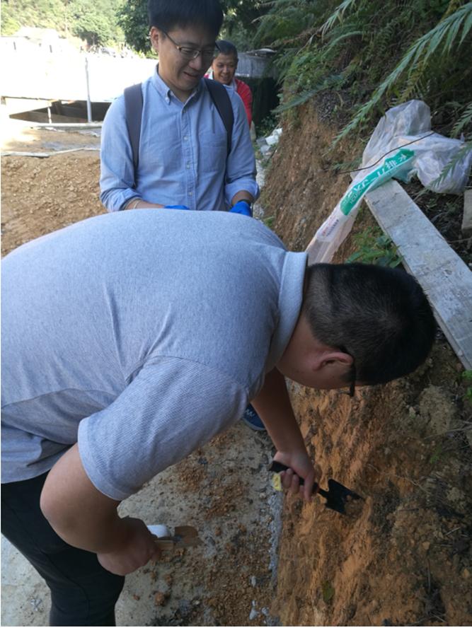 图6 刘骏龙老师及梁志辉老师对矮岭村马蹄笋种植园的灌溉用水和土壤进行取样