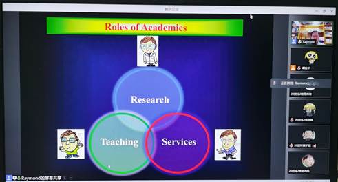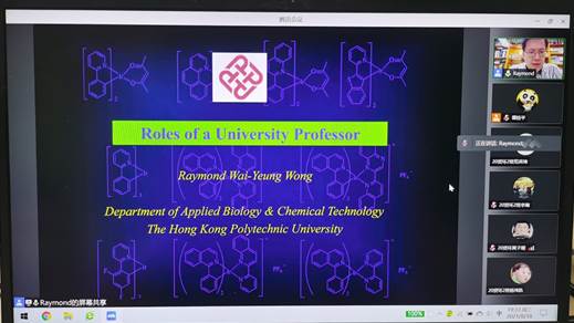 2021818日,香港理工大学应用科学及纺织学院院长、应用生物及化学科技学系讲座教授黄维扬老师应邀为学院师生作海外名师系列网络讲座的第三讲,题目为一位大学教授的不同角色。黄维扬教授分别从科研、教学和社会服务这三方面,与学院师生分享作为一位大学教授不同角色的经验,黄维扬教授结合自己担任学系讲座教授、科研期刊编辑、香港化学会主席等亲身经历,与大家畅谈课程教学、论文投稿及利用学术知识为社会作贡献服务的心得体会,并与学院老师进行了关于科研及教学工作方面的讨论,参加讲座的师生均表示获益良多,讲座取得了很好的效果。