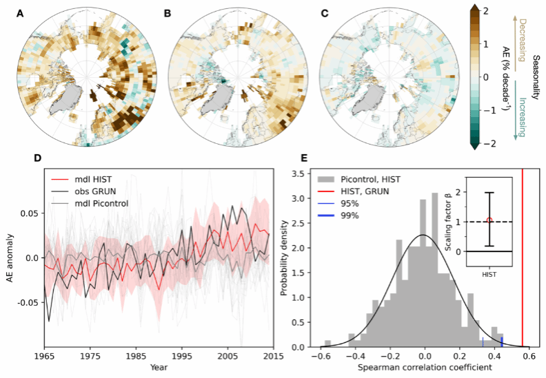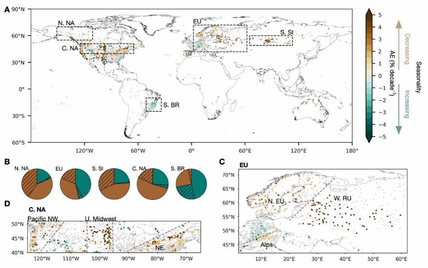河川径流季节性描述了径流年内周期性变化,对洪涝和干旱的发生起着重要作用。同时,不同季节的河川径流为淡水生物提供了重要的栖息场所。然而,表明气候变化已经影响了河流流量季节性(RFS)幅度的证据仅限于本地研究,并且主要集中在平均或极端流量的变化上。为此,南方科技大学博士生王泓和华北水利水电大学刘俊国教授等,以1965-2014年间全球10120个水文站点的月河川径流数据为基础,以分配熵作为分析河川径流季节性的方法,综合运用最优指纹检验和基于斯皮尔曼相关系数的两种气候变化检测和归因方法,评估了全球河川径流季节性的空间分布格局、历史演变趋势及其驱动机制研究发现,约21%的水文站点(2134个)的河川径流季节性发生了显著变化,河川径流的季节性在北半球高纬度地区(50°N以上)明显减弱。具有显著季节性变化趋势的站点数量与具有显著年变化趋势的站点数量相当,但约三分之二的站点年径流并没有发生显著变化,说明全球径流季节性变化主要表现为径流的年内再分配。