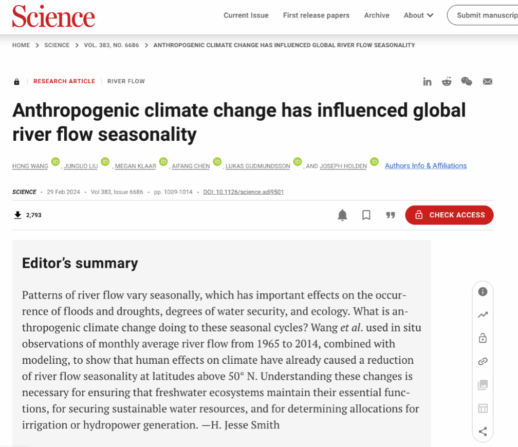 陈爱芳特聘副教授作为合作者与南方科技大学博士生王泓和华北水利水电大学刘俊国教授等在全球河川径流变化方面的研究取得重要进展,相关研究成果以《Anthropogenic climate change has influenced global river flow seasonality》为题发表在国际顶级学术期刊《Science》。