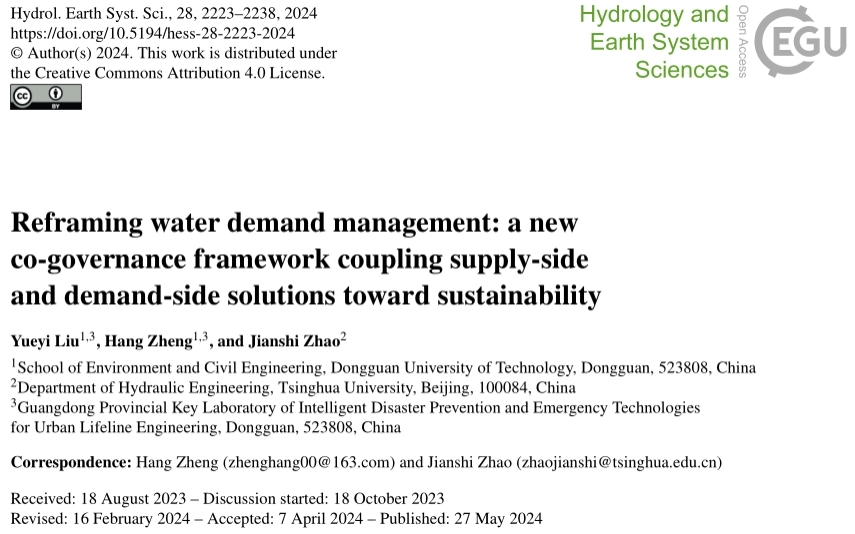 近日,环建学院郑航副教授团队在地球科学1区TOP期刊《Hydrology and Earth System Sciences》上在线发表题为“Reframing water demand management: a new co-governance framework coupling supply-side and demand-side solutions toward sustainability”的最新研究成果。论文以爱爱视频