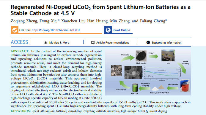 广东省新型纳米材料研究与应用工程技术研究中心研究团队近期在废旧锂离子电池正极回收再生领域中取得新研究进展,该研究成果以“Regenerated Ni-Doped LiCoO2 from Spent Lithium-Ion Batteries as a Stable Cathode at 4.5 V”为题发表在国际著名期刊《ACS Applied Materials & Interfaces》(IF = 9.5,JCR一区)。学院郑泽强硕士研究生为第一作者,谢东副教授与程发良教授为论文的共同通讯作者。