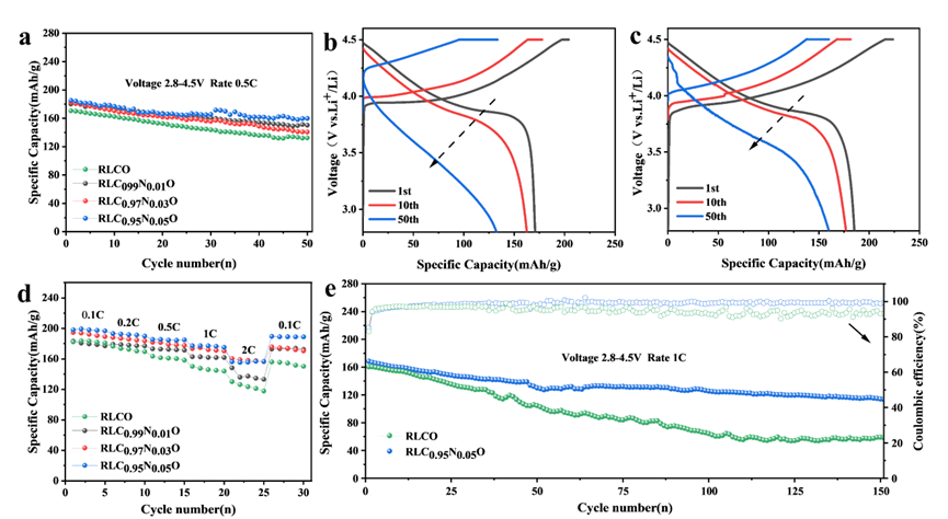 该方法涉及预处理、氯化焙烧、水浸和离子掺杂,以再生镍掺杂 LCO (Ni-RLCO) 材料。镍的掺杂有效提高了LCO正极在4.5 V下的电化学稳定性。Ni-RLCO正极在0.5 C倍率下表现出185.28 mAh/g的高放电比容量,50次循环后的容量保持率为86.3%,在2 C下表现出156.21 mAh/g的优异倍率容量。这项工作为将废旧LCO升级为在高电压下具有长期循环稳定性的高能量密度电池提供了一种重要的方法。