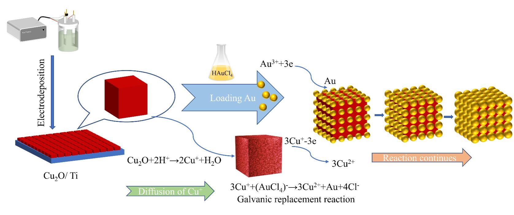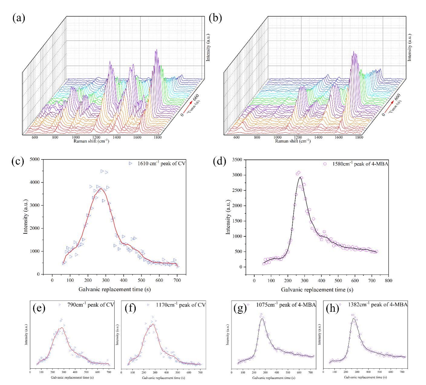 本研究提出了一种基于置换反应(GRR)的原位调节纳米结构间隙的SERS基底优化方法。在该方法中,通过利用GRR,贵金属纳米颗粒在牺牲模板表面生成和生长,从而调节纳米颗粒间的间隙。研究团队选择Cu2O/Ti作为牺牲模板,通过与HAuCl4溶液进行GRR,制备了Cu2O – Au基底。通过实时监测GRR过程中SERS信号的变化,找到基底的“最佳状态”。优化后的Cu2O–Au基底展示了优异的SERS性能,对结晶紫(CV)和4-巯基苯甲酸(4-MBA)分子的拉曼增强因子高达108和106,检测限(LOD)分别为1.96 × 10-11 M和1.08 × 10-8 M,且具有良好的重复性和稳定性。这些研究结果表明本研究中提出的基于GRR的原位SERS基底优化制备方法的可行性并在SERS基底制备技术中的潜在应用前景。