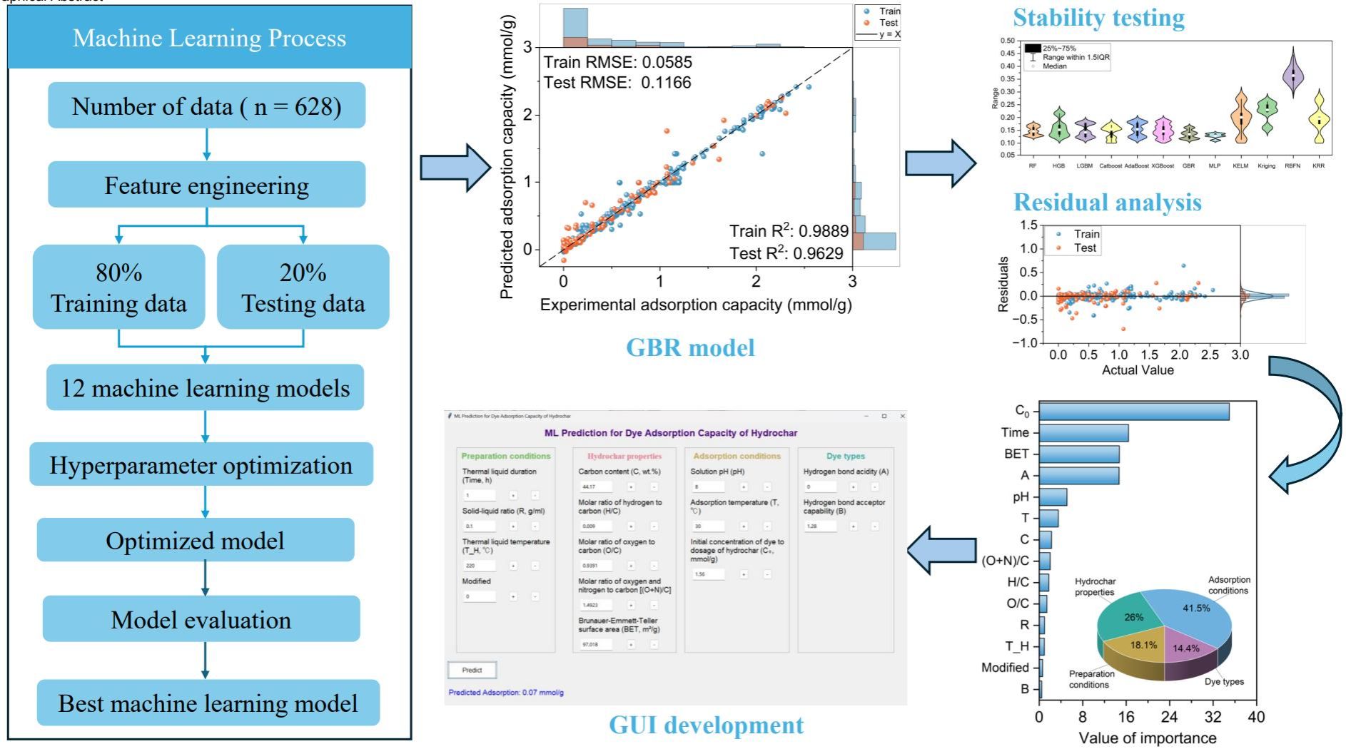 此外,本团队在染料废水处理领域取得了新进展。通过结合机器学习和实验验证,开发了一种能够精准预测水热炭吸附性能的模型。该研究围绕水热炭(Hydrochar)在染料废水中的吸附能力展开。这项研究评估了十二种机器学习模型的表现,结果表明,梯度提升回归模型(GBR)在预测吸附性能方面表现最为优异,模型预测精度达到了0.9629。通过实验验证,模型的预测准确率达到了0.8704,进一步证实了其在实际应用中的潜力。这一成果不仅为水热炭在吸附性能方面的研究提供了数据支持,也为废水处理技术的进一步发展奠定了坚实基础。此外,这项研究开发了一个简单易用的图形用户界面,大幅提升了实验设计的效率,推动了机器学习在环境工程中的实际应用。