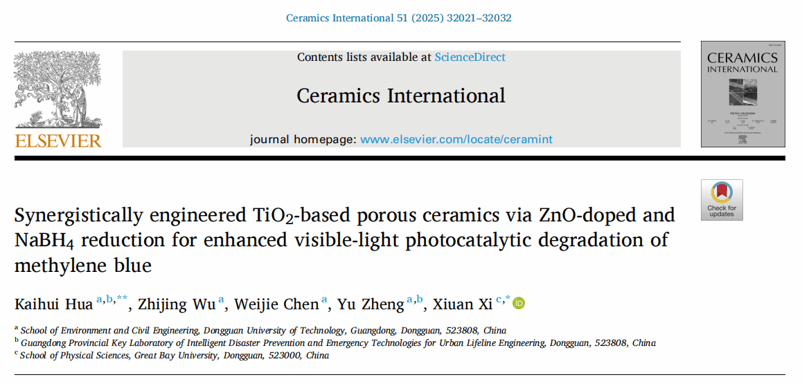 近日,郑愚副校长、花开慧副教授、伍芷菁(研究生)、陈伟杰(研究生)和大湾区大学奚修安研究员在陶瓷材料领域国际权威期刊《Ceramics International》上在线发表题为“Synergistically engineered TiO2-based porous ceramics via ZnO-doped and NaBH4 reduction for enhanced visible-light photocatalytic degradation of methylene blue”的最新研究成果。花开慧副教授为论文第一作者与通讯作者,奚修安研究员为共同通讯作者,爱爱视频