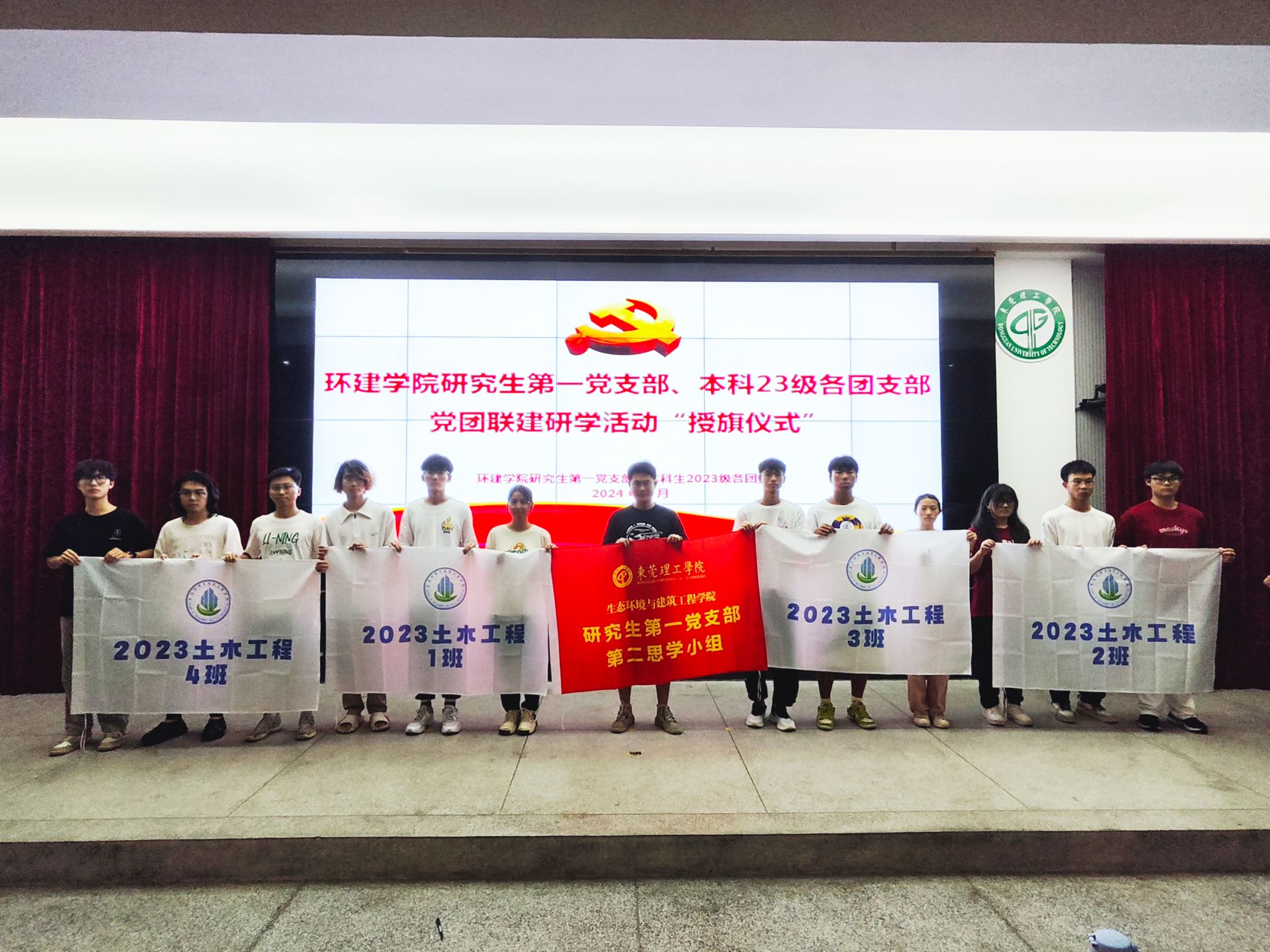 接下来,会议进入第二项议程,“党团联建研学活动授旗仪式”。此前,环建学院研究生第一党支部在4月18日召开了“党团联建研学活动启动仪式”;为使活动更好地开展,并注入更多活力,支部研究生党员代表提议在本次会议中加入此次党团联建活动的授旗仪式,使得活动氛围、活动导向更加振奋人心。