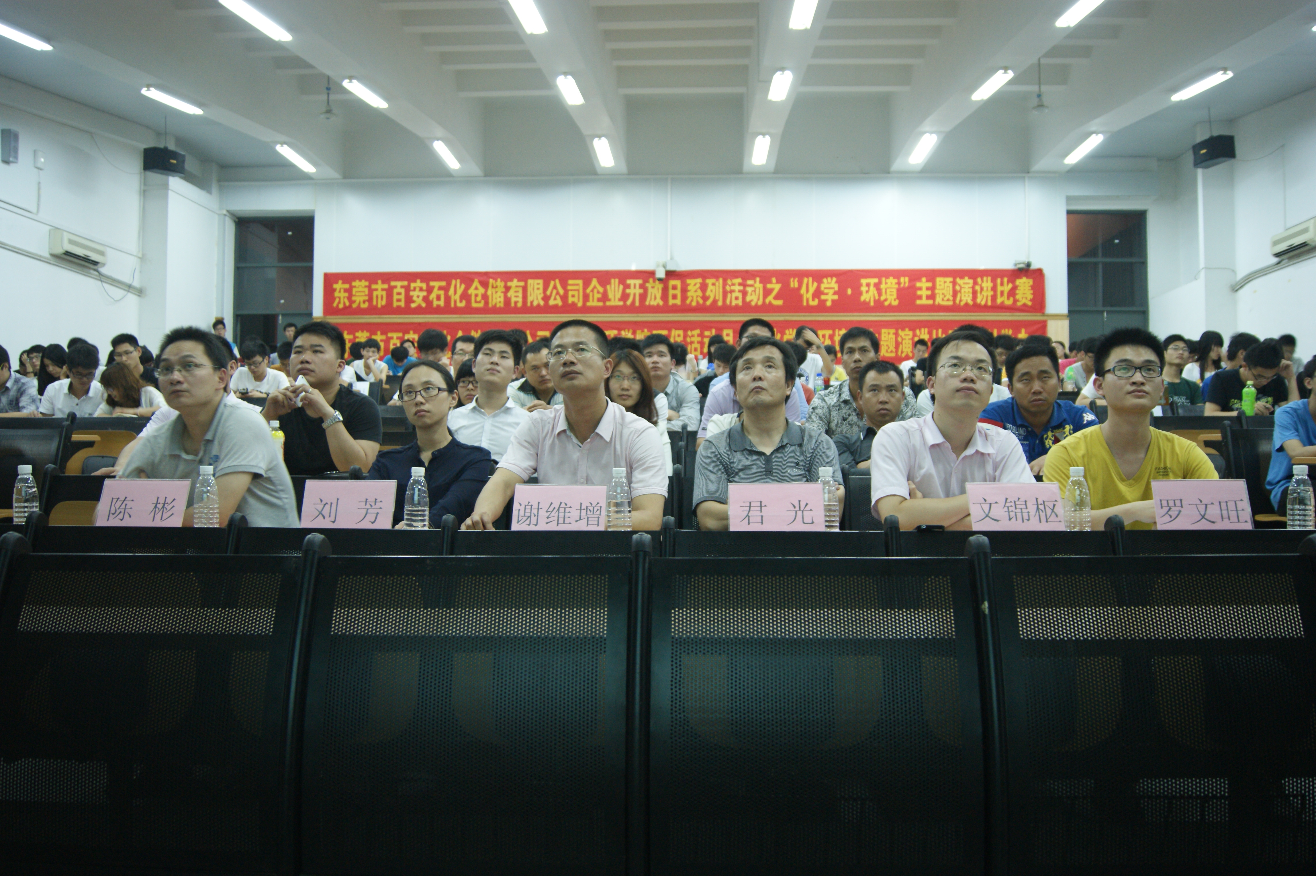环保活动月之“化学·环境”PPT设计与演讲比赛在教学楼6E206举行。本次比赛的嘉宾有来自于化环学院党总支书记君光老师,党总支副书记袁荫贞老师,团总支书、辅导员文锦枢老师,临时辅导员罗文旺老师,东莞市百安石化仓储有限公司的谢维增经理、刘芳主管、钱萌主管和陈彬主管。百安石化仓储有限公司的20名员工及化环学院学子到场与会。经过初赛,共选出11名选手进入本次决赛。