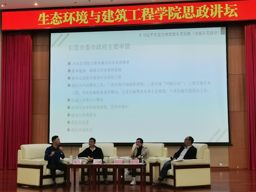 “思政讲坛”特邀马克思主义学院唐元松教授、银锋教授,以及本院优秀校友梁连根、郑汉江于松山湖校区学术会议中心阶梯报告厅作题为“生态东莞——绿水青山就是金山银山”的专题讲座。环建学院师生近500人聆听了讲座,讲座由环建学院20级辅导员雷菲老师主持。