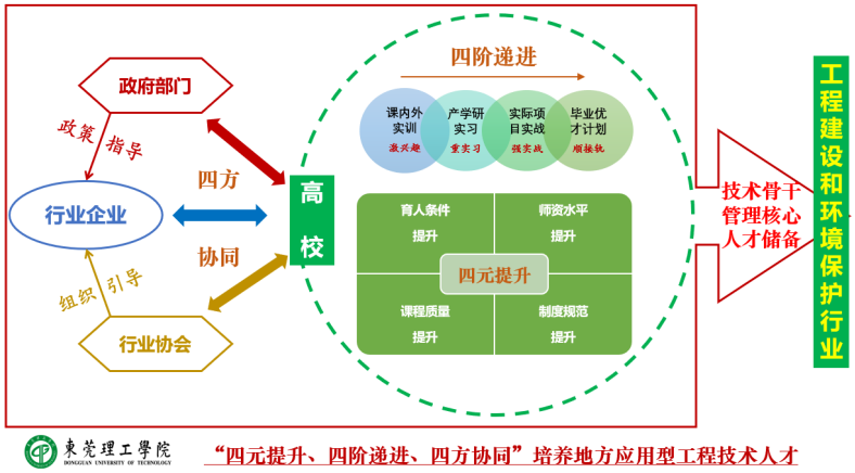 始终秉持着培养、输送具有创新精神和实践能力的高素质、应用型工程技术人才的职责,打破拘囿、开拓创新,以教学质量为生命线,不断深化教育教学改革,实践育人,创新育人,构建了“四元提升、四阶递进、四方协同”的地方应用型工程技术人才培养体系。