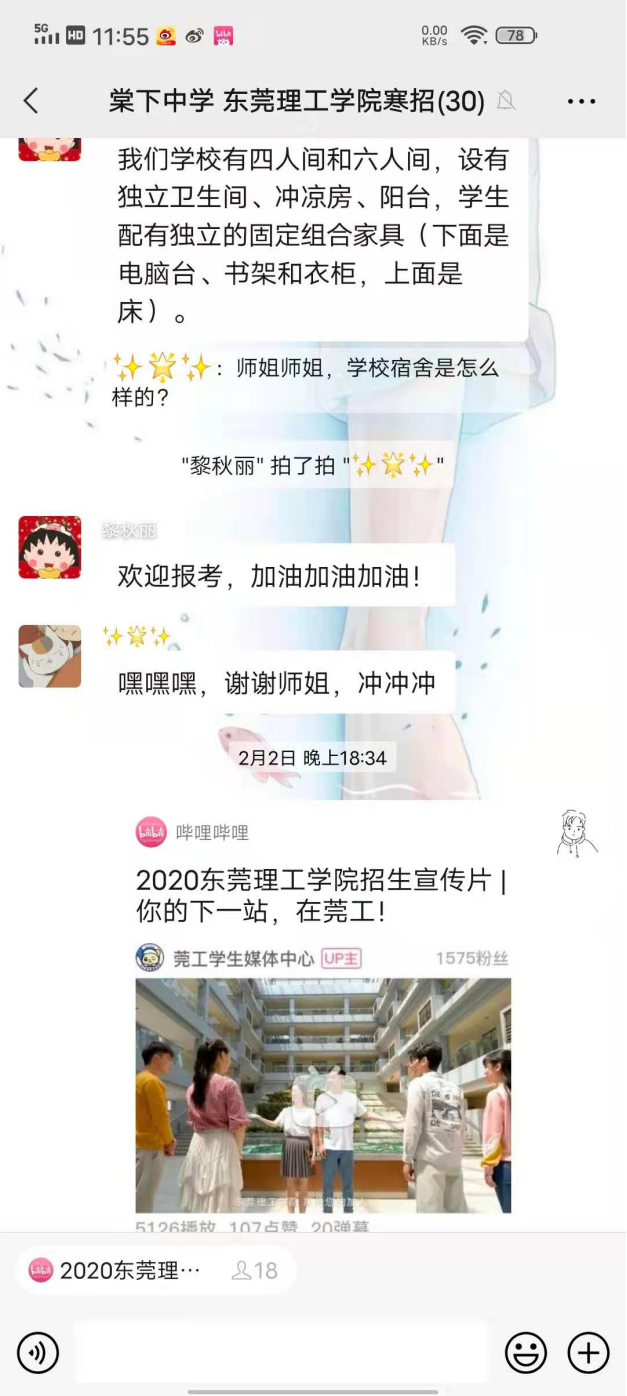 寒招队员线上发送视频等相关资料,向学子们介绍学校的基本情况,包括学校的地理位置,建设现状,学科专业,师资力量,科研情况等。同时也对家长关心的人才培养模式,毕业后的就业前景,广东省的招生政策和我校今年的招生新变化进行详细地讲解。在宣传过程中,寒招队员耐心解答考生们关心专业和社团活动的问题。学子们通过寒招队员的讲解和答疑,对爱爱视频