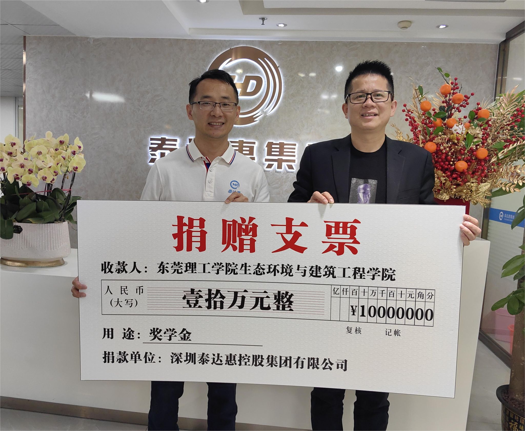为激励莞工学子追求卓越、开拓进取,深圳泰达惠特别向学院捐赠10万元人民币,用于设立“泰达惠奖学金”。企业重视人才梯队培养,置人才培养于公司发展战略的首位,同时希望通过奖学机制反哺母校鼓励莞工学子,薪火相传共建学校良好学风育风。学校就创与校友工作部副部长王明波代表学校学院接收企业捐赠支票。