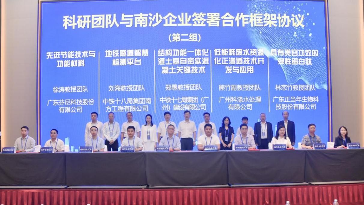 为提高科技成果转化和匹配效率,大会精准对接企业发展问题和技术需求,与东方电气、中铁建等央企巨头,中科宇航、芯粤能等“独角兽”企业以及一批在各自行业内处于领先地位的企业、高速成长型企业成功对接校企产学研合作项目18个,16个合作项目的双方代表现场签署技术合作框架协议。其中,郑愚教授作为团队负责人就"结构功能一体化渣土基自密实混凝土关键技术"项目与中铁十七局集团(广州)建设有限公司丁德鹏总工程师现场签署产学研合作框架协议。后续,双方将在“校企合作、产学双赢”的基础上,就该项目开展全面合作,建立常态化联系机制,共同为提升项目产品技术水平、加快项目成果市场化进程提供场景及资源支持,并从科技成果转移转化、人才培养与合作等方面开展具体工作,为推动科技创新和服务大湾区高质量发展提供更加坚实的支撑和保障。