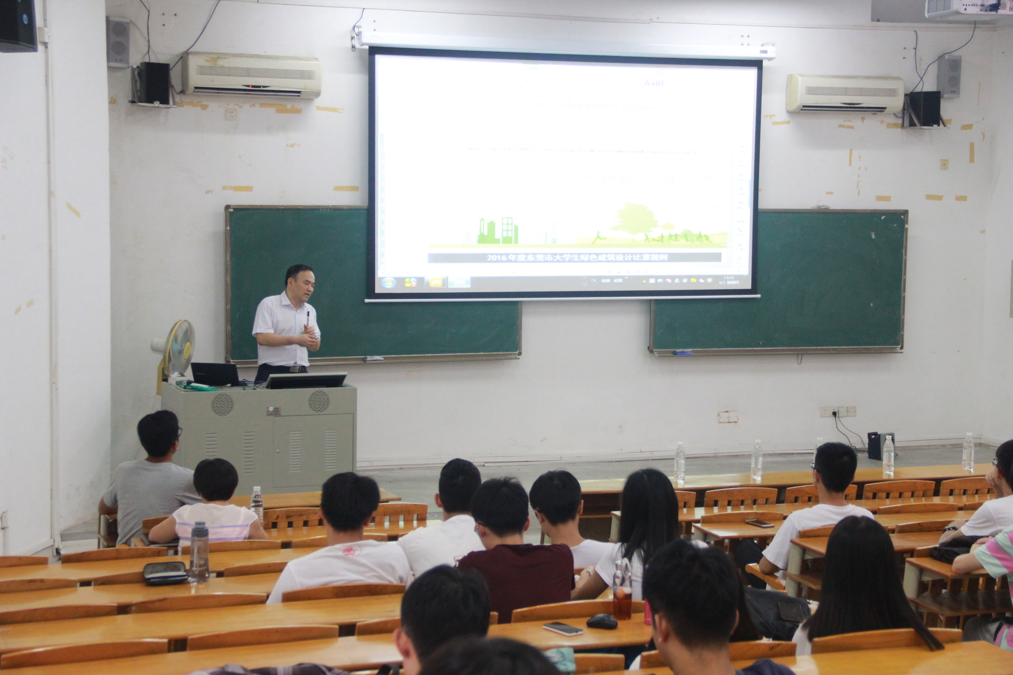会议伊始,于国友教授向在场的学生强调了绿色建筑的宗旨和意义,用典型的绿色建筑和普通建筑作对比,阐述绿色建筑在人文与自然,社会与环境协调的重要性。随后,于教授向学生详细介绍了往届绿色建筑设计大赛的优秀作品,并从墙体、房屋结构、排水功能、隔音等方面多角度分析往届学生作品存在的问题以及改良方法,使在场学生对本次大赛有了更深一步的了解。