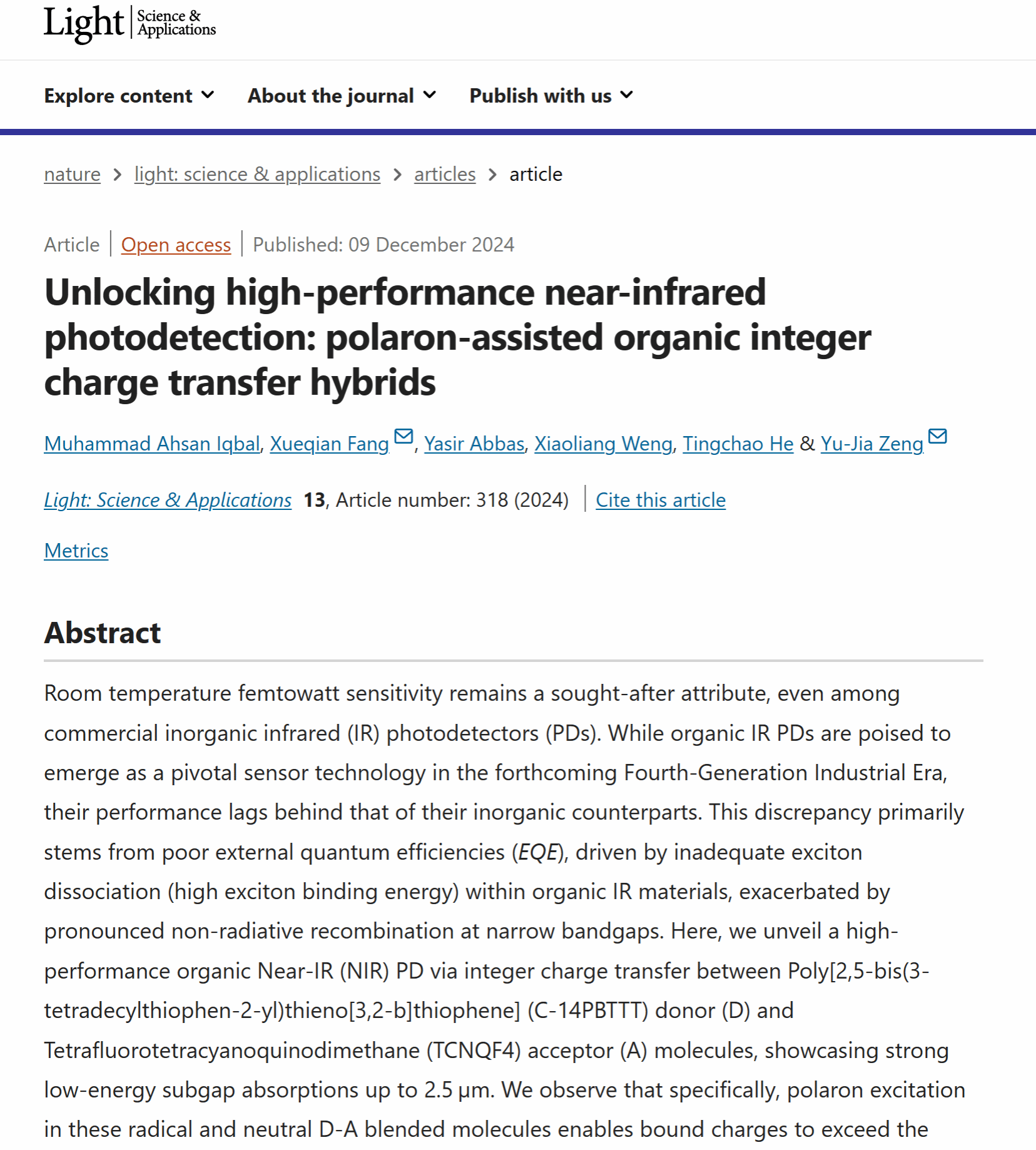 最近,Nature子刊、国际光学顶级期刊《Light: Science &Applications》(IF:20.6)刊发学院房学谦教授课题组在近红外光探测领域的新成果,题为“Unlocking High-Performance Near-Infrared Photodetection: Polaron-Assisted Organic Integer Charge Transfer Hybrids (解密高性能近红外光探测:极化子辅助的有机整数电荷转移混合法)”,Muhammad Ahsan Iqbal博士后为论文第一作者,房学谦教授和深圳大学曾昱嘉教授为通讯作者,东莞理工为论文第一完成单位。