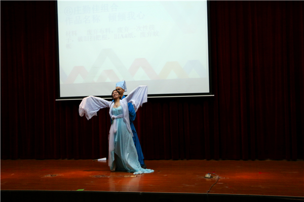 团总支常务副书记洪沛雄致辞,对此次活动表达了美好的祝愿。而后便开始了精彩绝伦的时装秀,此次时装秀分为个人赛及团体赛。活动开始,所有参赛选手依次上台,其中不乏利用纸盒、碎布、塑料袋、废旧报纸、蚊帐及麻袋之类的环保材料制作成的佳作,场下阵阵掌声响起。解说员就作品的创意来源及材料选用之道展开演说,在背景音乐的配合下,模特们自信地展示其风采,美轮美奂。其中许仙白娘子的DIY版本,融合了古今中外的特色元素,独到之处精妙绝伦,赢得评委及观众的阵阵赞赏及惊叹。最后的全场走秀展示更是给大家展现出一场视觉盛宴,一位位模特从身边走过,掀起了热潮。随后,爱爱视频