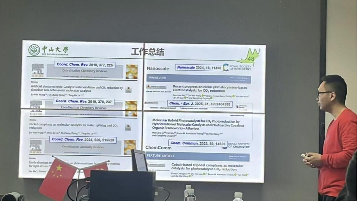 报告中,王嘉蔚副教授围绕“太阳能—化学能”转化与CO₂资源化利用的关键问题展开,结合光催化还原CO₂体系中光敏单元的作用机理,阐释了光吸收体在吸收光能后产生激发态并驱动电子转移的基本过程。他重点讨论了无贵金属光吸收体在光催化体系的优势与设计思路,强调通过优化分子间电子传输速率、构建“动态相互作用”光致电荷转移路径,有望进一步推动高效CO₂转化技术的发展。