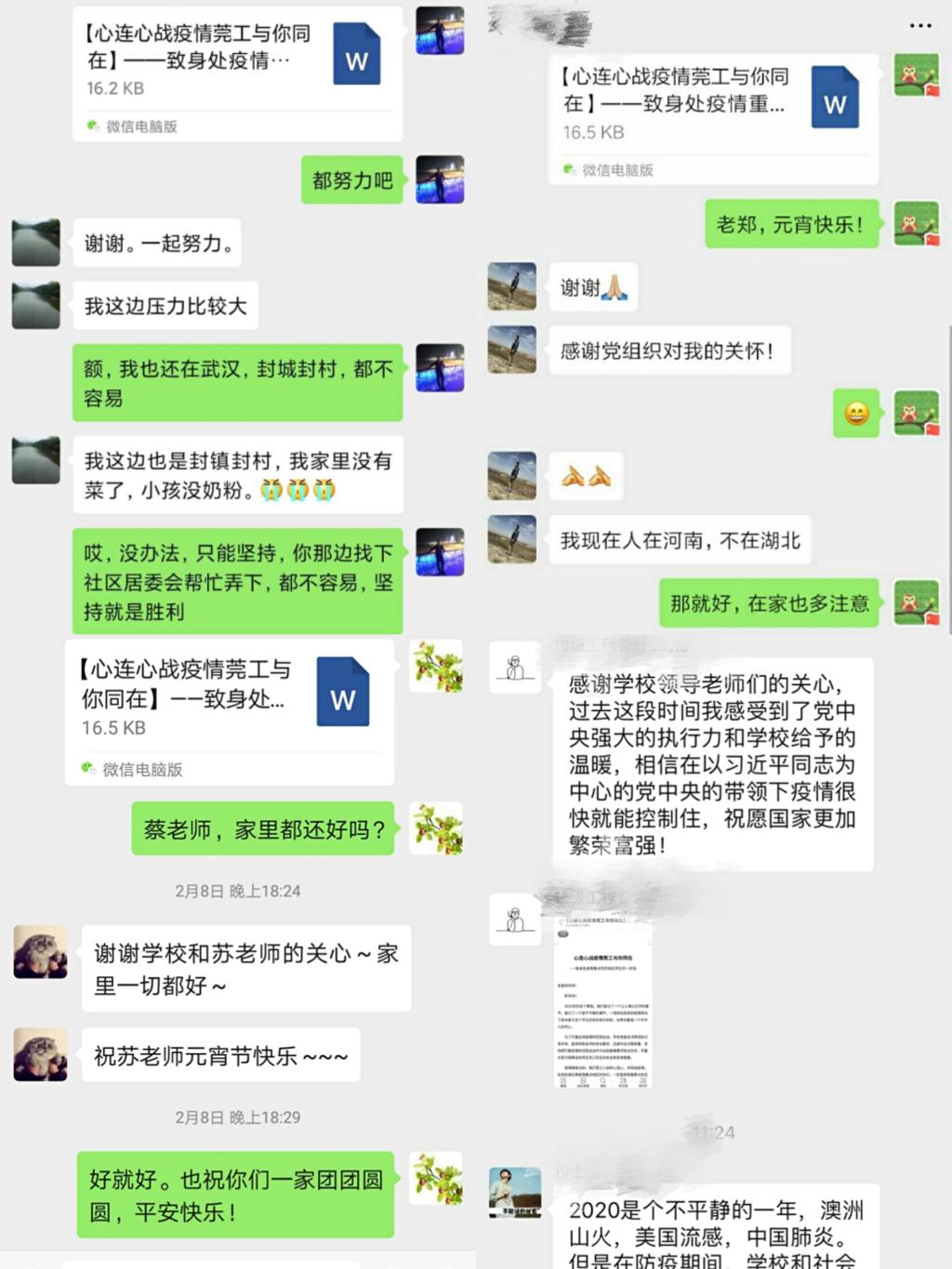 环建学院响应校党委的号召,通过各支部书记以点对点的方式给每位湖北籍以及在疫情重点防控区域的师生们,发出一封封问候的书信。通过书信的方式沟通,让大家正确认识疫情,主动反馈问题,积极联系组织,认真做好防控工作。