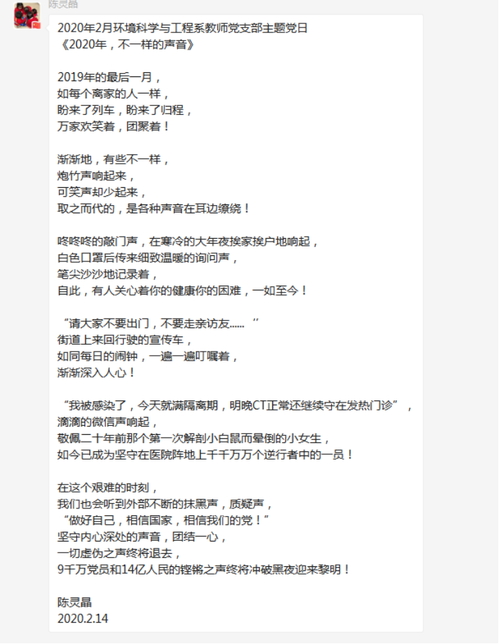 学院全体师生党员以谈感受、说体会、写心得的形式,通过视频、图片、网页对新冠病毒有了全面、科学的认识,对奋战在疫情防控一线的工作人员表达深深的敬意。党员们都纷纷表态,坚决服从学校的工作安排,众志成城、万众一心打赢这场疫情阻击战。