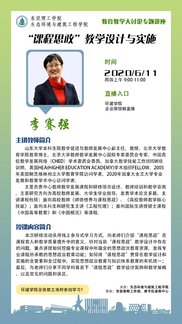 6月11日,根据学校教育教学大讨论工作总体部署及“环建学院教育教学大讨论工作实施方案”安排,环建学院“课程思政”主题学习及能力提升工作坊系列活动正式启动。