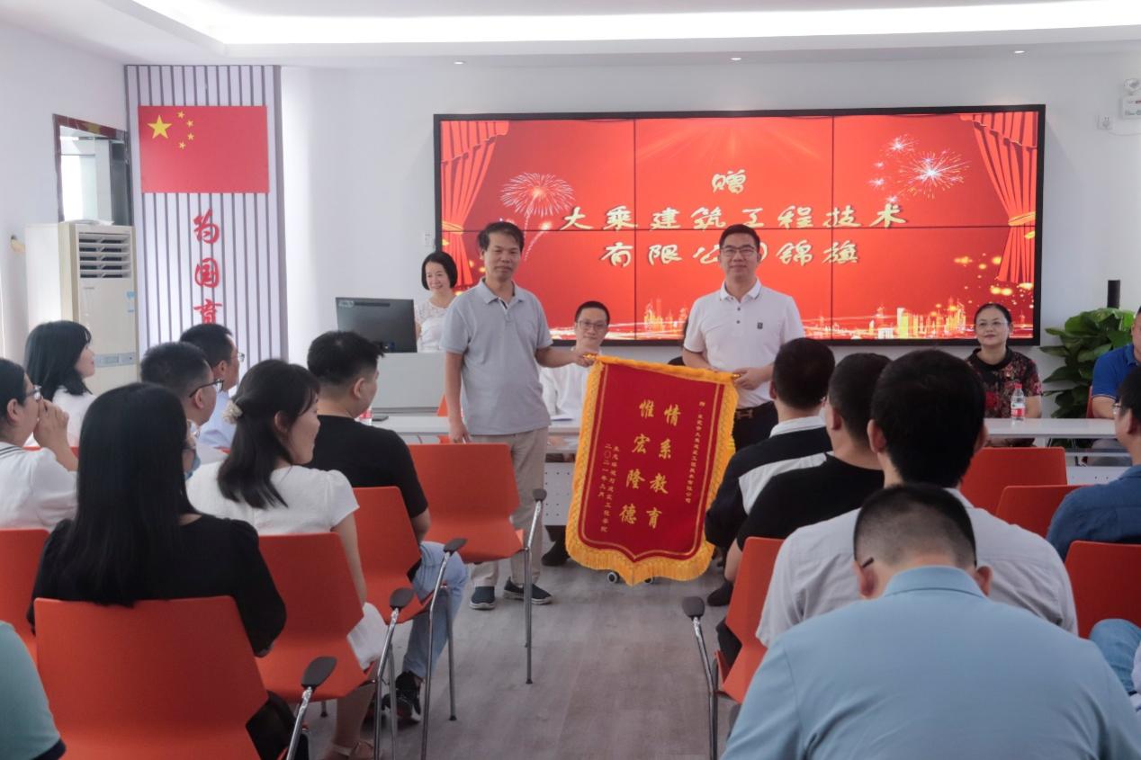 会上诸小妮副书记介绍了环建教工小家从设计到施工完善的过程,并表示教工小家是学院为丰富老师工作之余提供的活动、休憩场所,同时也感谢大乘建筑工程技术有限公司的大力支持。随后,学院授予大乘建筑“情系教育 惟宏隆德”锦旗,罗伟全总经理上台致辞,祝贺环建学院教工小家的竣工,他表示“十年树木百年树人,希望在未来能为推进教产融合、拓展校企深度合作模式,略尽绵薄之力。”