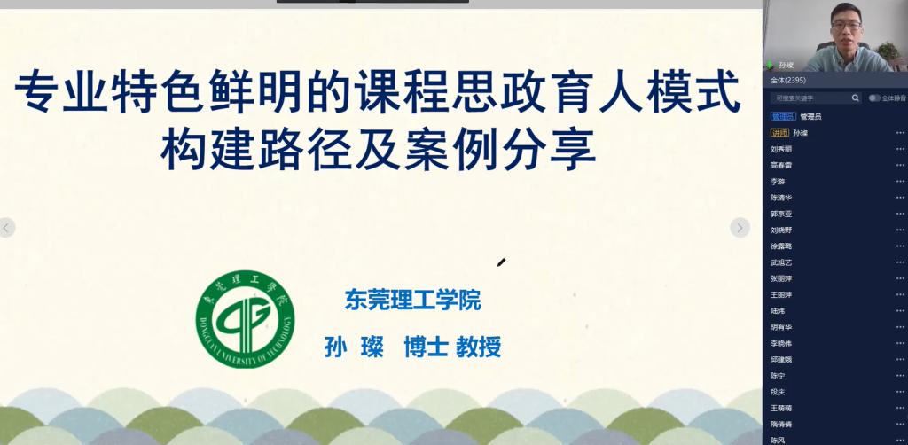 直播课上,孙璨首先通过问卷调研的方式引导参训教师对于课程思政改革实践过程及成效进行反思,共计收回2500多份教师反馈问卷。进而,孙璨简要介绍了我校及环建学院专业的建设发展历程,并结合问卷调研结果,围绕“如何结合人才培养定位和专业特色有组织协同地构建课程思政育人实施路径和模式”这一主题,从“关于课程思政的几点思考”“基于专业特色的思政育人模式构建”“案例分享与反思”及“一次课教学过程展示”等方面深入浅出地进行了讲解、分享及展示,课程共历时2个小时。