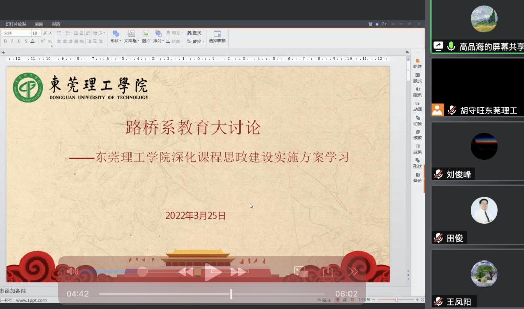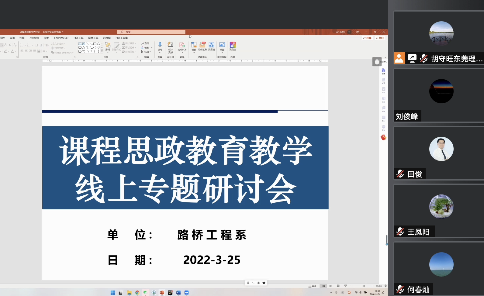 为贯彻落实全国教育大会和全国高校思想政治工作会议精神,按照学校和学院统一部署,3月25日上午,环建学院路桥工程系组织召开本学期“课程思政教育教学”线上专题研讨会并进行了系内集体教学观摩活动,路桥专业负责人及路桥系全体教师参加会议。会议由路桥系系主任胡守旺老师主持。