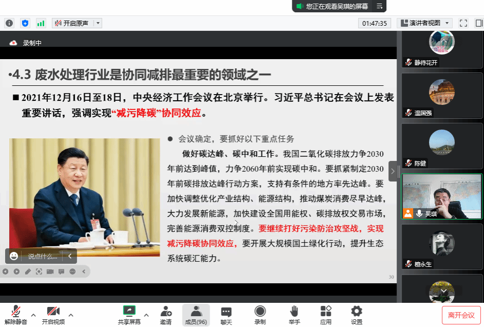 会议开始,松山湖环保促进会秘书长温国强高工指出“双碳”目标的提出对水污染防治领域产生了两个重要影响:(1)如何采用低能耗流程治理污染;(2)如何促进再生水的循环利用。