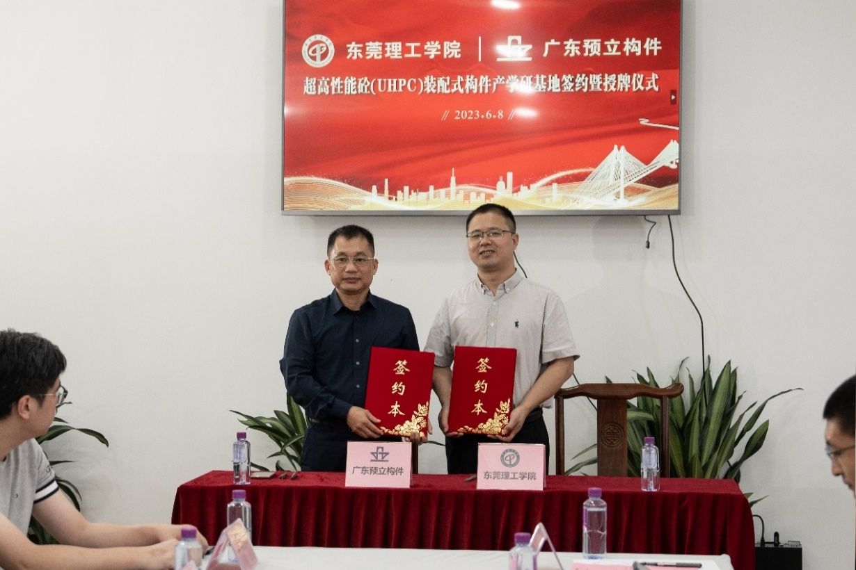 与广东预立预制构件有限公司正式签署“UHPC(超高性能砼)装配式构件产学研基地”合作协议。通过本次产学研基地合作,双方将在新型建筑材料、装配式集成房屋等方面进行技术优势整合,共同探索UHPC等新材料在装配式建筑领域方向的发展与应用,推动更多科技成果的研发和转化。