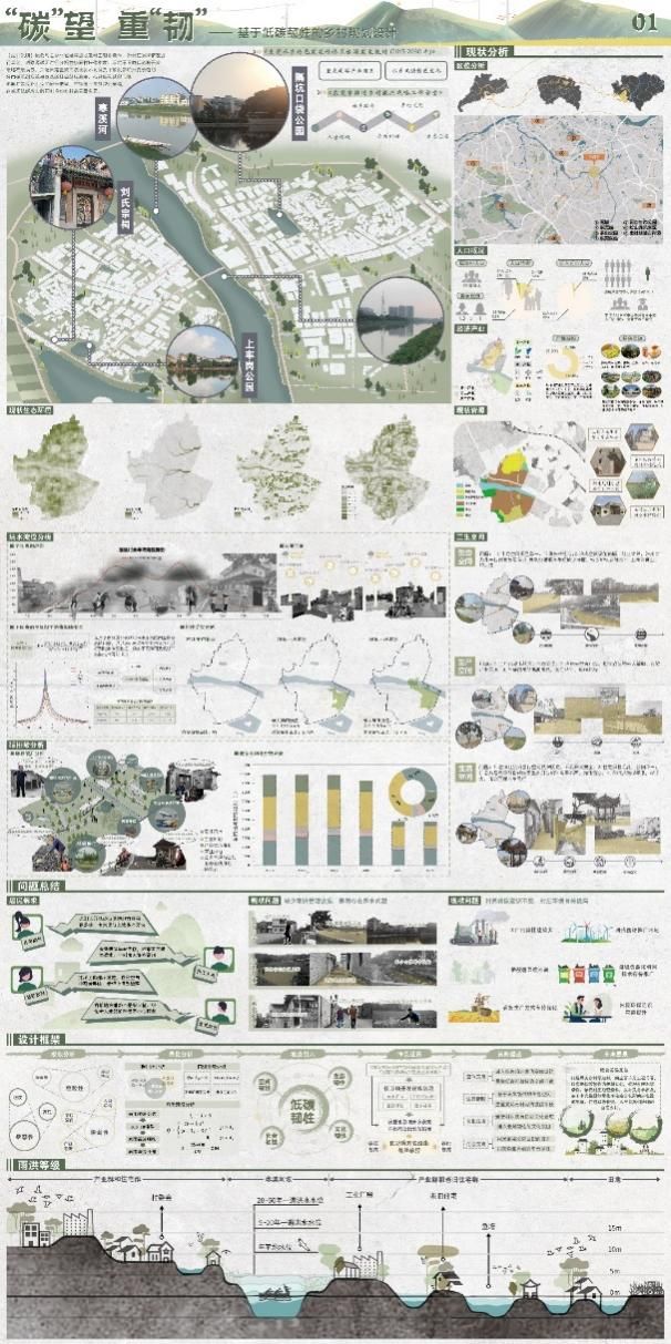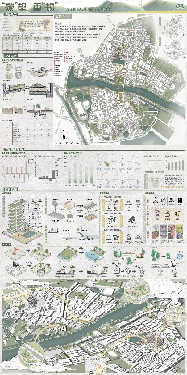 近年来,为了减少气候变化加剧、极端天气频发和社会风险叠加带来的影响,韧性乡村、海绵城乡的建设成为热潮。2022年,住房和城乡建设部、国家发展和改革委印发城乡建设领域碳达峰实施方案,提出了建设绿色低碳城市,打造绿色低碳县城和乡村。在低碳和韧性成为城乡建设热点的背景下,本次获奖的作品“‘碳’望、‘重’韧——基于低碳韧性的乡村规划设计”参赛团队,将城市规划专业背景与环境工程专业背景知识相融合,展现了交叉学科合作的优势,结合水文模型等量化模型与乡村规划理论,体现了作品的科学性和创新性。