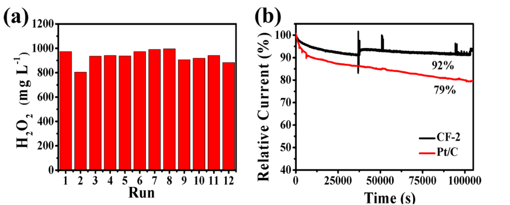 该研究通过在F2/Ar下,通过调节温度(25~65℃)和时间制备不同氟含量的氟掺杂碳催化剂。该催化剂可以作为电极阴极,在酸性介质中合成H2O2,并通过CV、LSV、EIS等证明了该催化剂对ORR表现出优异的电催化性能和催化耐久性。XPS实验数据和密度泛函理论计算DFT进一步证实了该催化剂电化学合成H2O2的机理。该研究结果为杂原子材料通过ORR制备H2O2提供了新的选择。